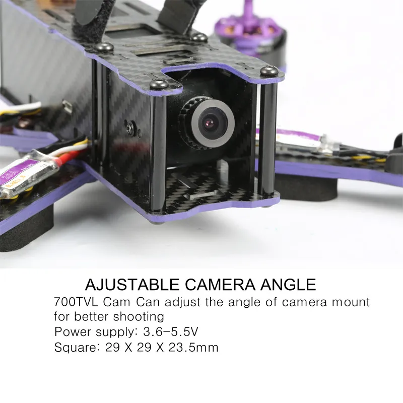 Compatible with max 5 inch propeller Compatible with 2206, 2208 motor Can be used with 4S/3S battery With Seft-protection function With direction indicator LED Inclined motor base design, fast speed Removable protection motor base |